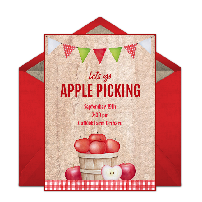 What could be more quintessentially fall? Head over to a local apple orchard to pick your own apples that can later be turned into delicious homemade pies, muffins, and cider. Send an apple picking invitation so friends can join you or host a caramel apple bar party after you've gone picking with this online invitation.