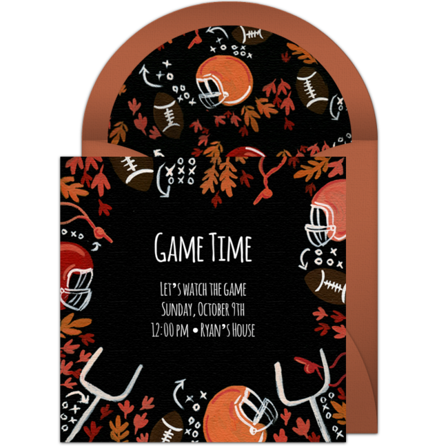 Whether you’re a fan of the NFL or your college alma mater, football season is in full swing! Check your team’s schedule for the next big game and invite friends to tailgate or watch the match with these online football invitations you can send by email or text. Need more inspiration? Check out these fall football party ideas and these tailgating party tips for a memorable event.