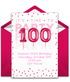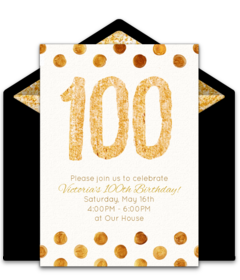 - Invitations: Create your event on Punchbowl and select the perfect 100th birthday party invitations for the party. Search for an invitation that suits the personality of the guest of honor. Make sure to specify the 100th milestone birthday to all of the recipients. Include a request on the invitation for guests to think of a memorable story involving the guest of honor to share during the party. Send the invitations 4-6 weeks before the party.