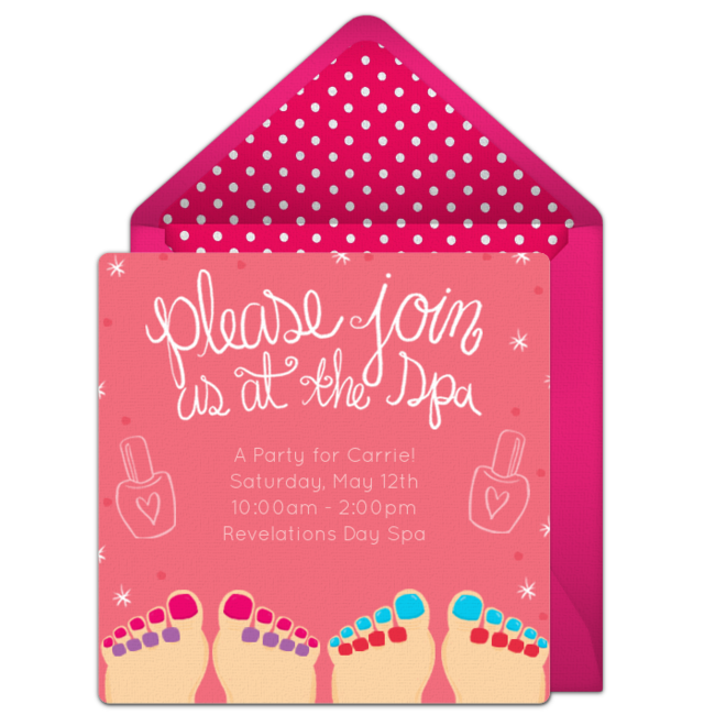 DIY facials, manicures, and relaxing vibes. Send these Spa Party or Spa Day invitations from any digial device then check out these Spa Birthday Party Ideas for more tips!