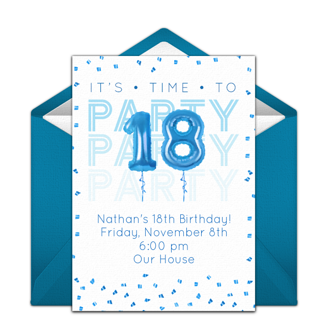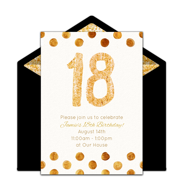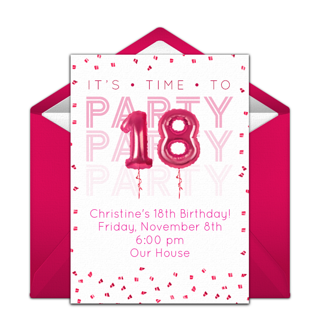 If you want the number 18 front and center in your invites, check out these online 18th birthday invitations that can be customized with event details and sent by email or text instantly.