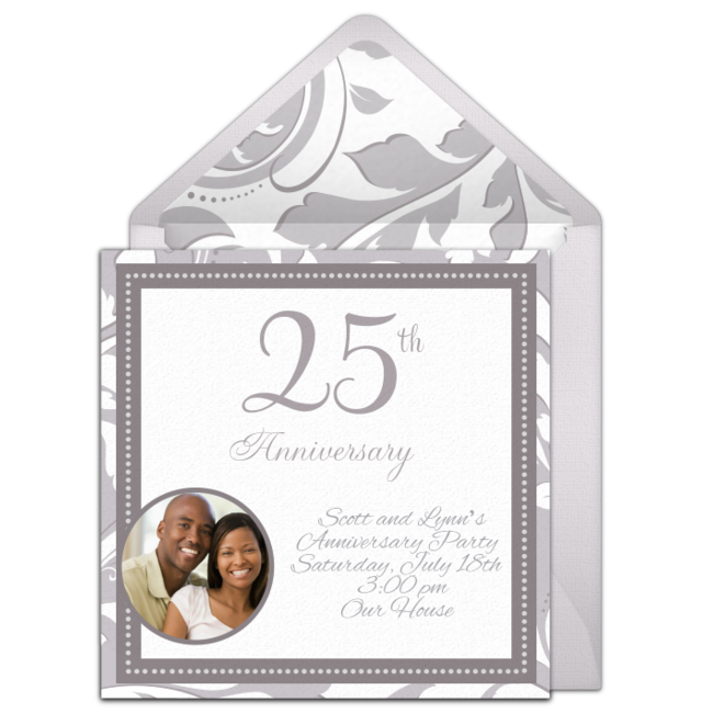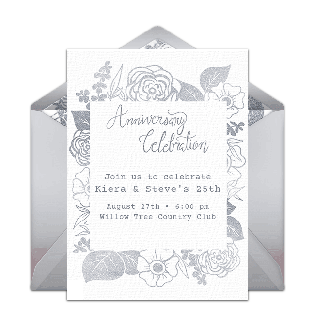 - Invitations: Browse our selection of free, online anniversary invitations for your 25th anniversary celebration on Punchbowl. Select an invitation with a silver color scheme to symbolize 25 years. Include information on the invitation such as the name of the event, the guests of honor, date, time, and location.