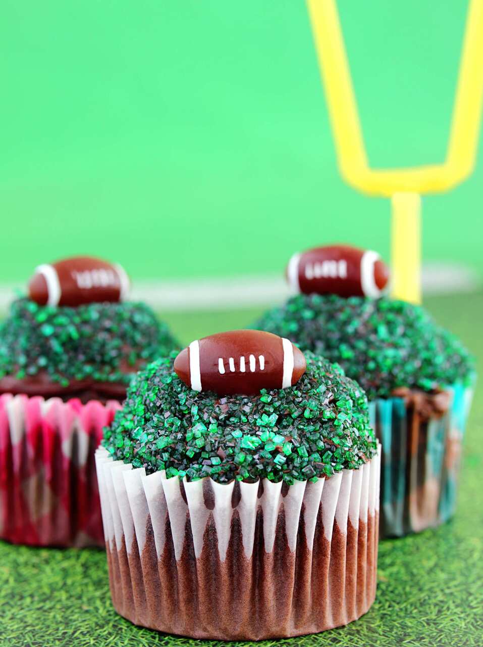 Bake the cupcakes according to the package directions. Once they're done baking and have cooled, spread frosting on the top and cover the tops completely with green sprinkles. Add a mini candy football or plastic football ring to the tops of the cupcakes as a final touch!