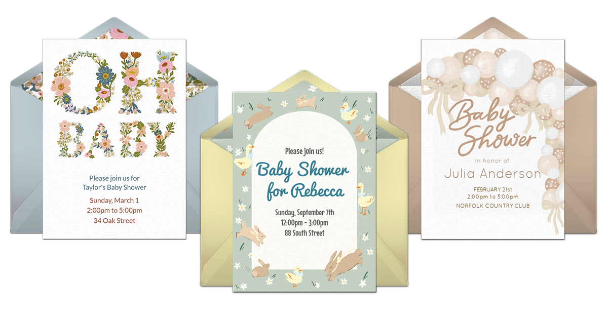 Punchbowl.com offers digital baby shower invitations in a wide range of themes, including floral, minimalist, rustic, storybook, and gender-neutral designs. Choose an invitation early to help solidify your theme.