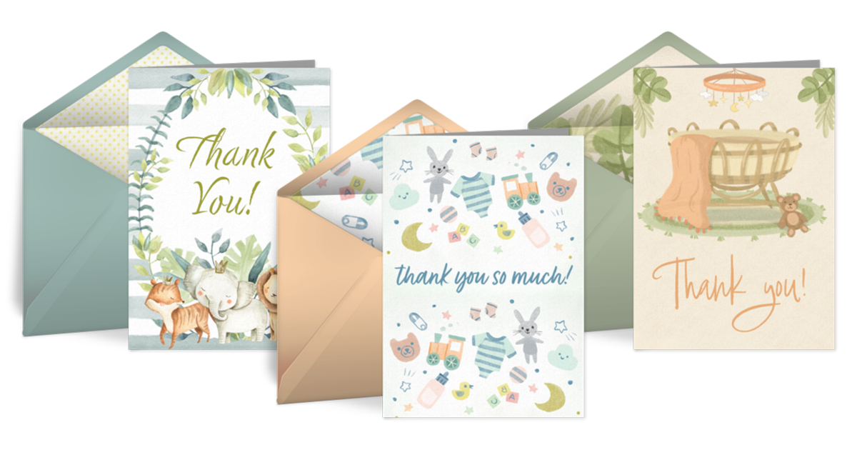 Punchbowl.com offers digital Baby Shower Thank You Cards that allow hosts to send personalized messages quickly. The ideal time to send thank-you cards is one to two weeks after the baby shower.