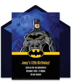 Send your online Batman birthday invitations 3-4 weeks before the party. Personalize your favorite design with important event details and incorporate Batman into your invite wording (“Batman invites you to Gotham City in honor of Evan's 7th birthday!"). If you want the kids to come dressed as their favorite superhero, make a note on the invitations so parents can be prepared. When your invites are ready, send by text or email and gather RSVPs in minutes.