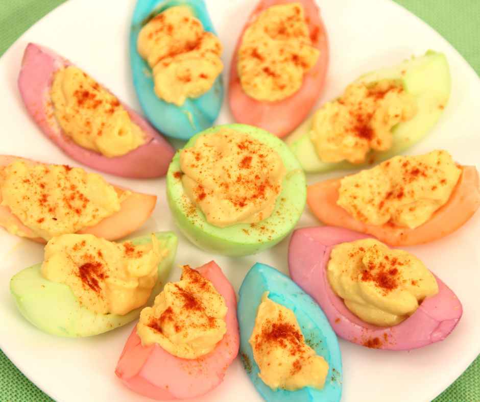 Pastel Deviled Eggs: Deviled eggs are a classic Easter snack idea, but this twist makes them extra special. Start by peeling the shells off of a dozen hard-boiled eggs and slice each egg in half. Remove the yolks and set them aside in a small bowl. For each color, you will need to fill a mug ⅔ full with cold water and add 3 drops of food coloring, and 1 teaspoon vinegar. Place the egg whites into the mug and remove quickly to check if they are the correct color. Be careful—egg whites will soak up the color very fast. Drain the colored egg whites on some paper towels while you mash the yolks with ½ cup of mayo and a little Dijon mustard. Spoon the filling into the egg white halves and serve cold.
