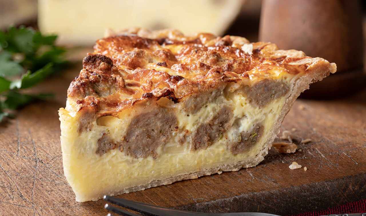 - Cook sausage and drain off fat. Pour over bread and egg mixture evenly. Top the entire quiche with grated cheese.