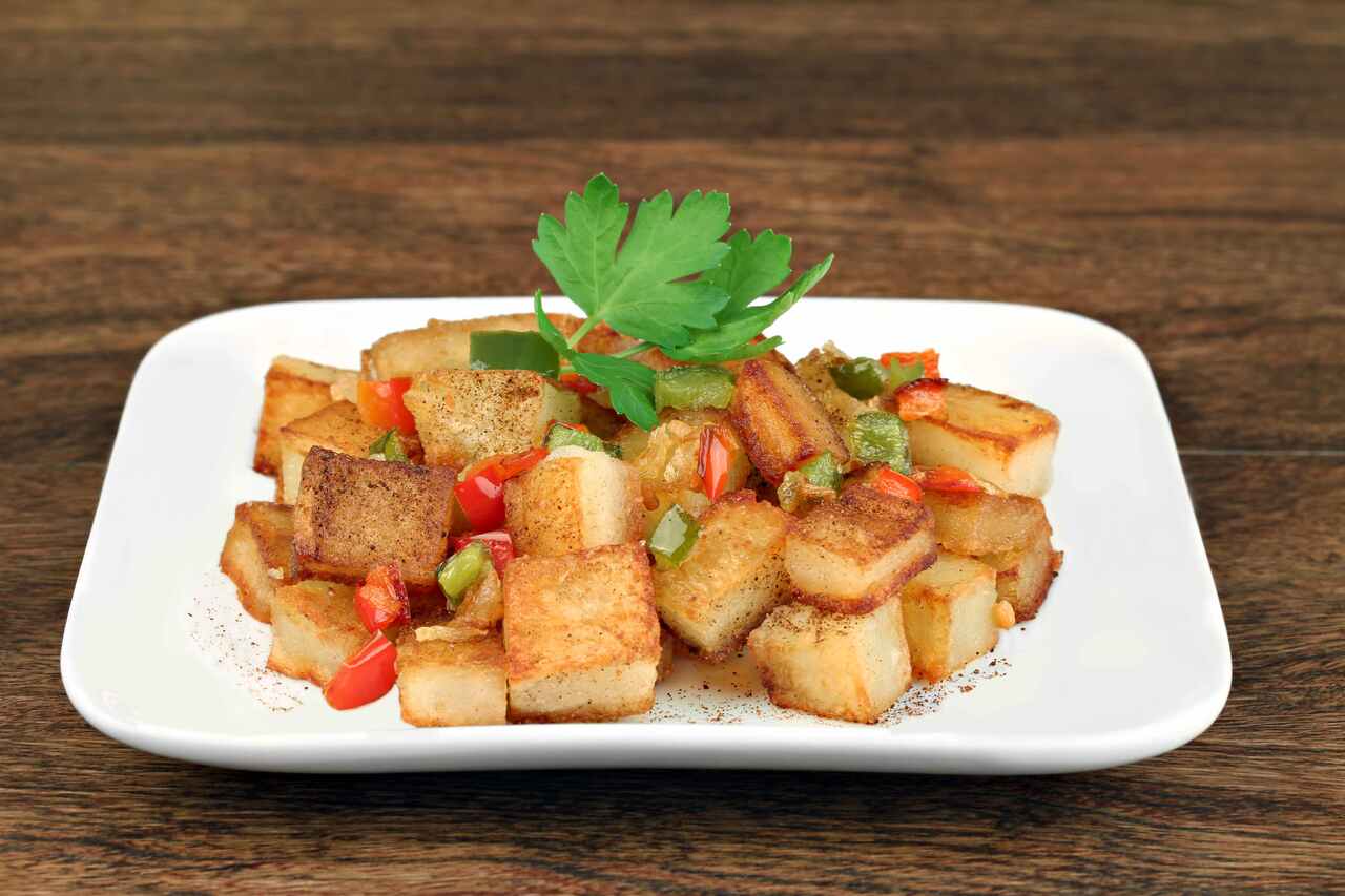 - Rinse potato cubes under cool water, drain well and pat dry.