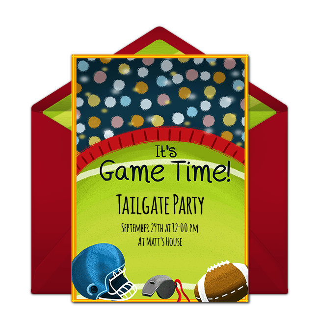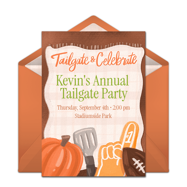 - Send online tailgate invitations. Customize a digital football tailgate invitation to share important event details with guests such as the meeting place and time, game time, and more! You can even create a potluck signup list in your online invitation and let guests easily sign up for items to bring along. Once your tailgate party invitation is ready, deliver it instantly by text or email. Guests can RSVP right from their phones and you can track RSVPs while on the go!