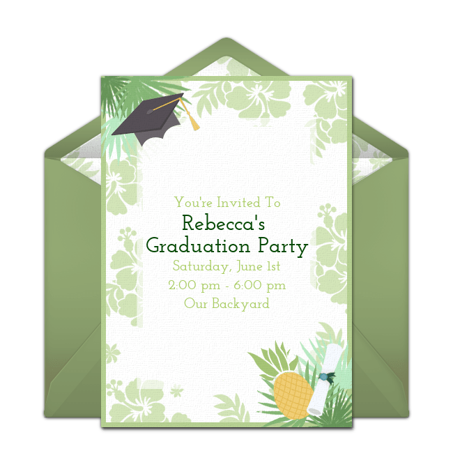 - Invitations: Start your party planning with free graduation invitations or customize luau invitations with important event details.You can even customize your envelope with an "Aloha" rubber stamp! Once your invitation is ready, send it by text or email and easily manage RSVPs online.