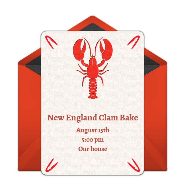 - Invitations: First, select an invitation with a summer scene to get guests excited for what’s to come. Send online clambake invitations that can be customized with a title, date, location, and more. Use clambake invitation wording such as: “Get ready for clams and lobsters underneath the summer sun!”