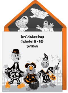 - Invitations: Send online Costume Swap invitations to all of your friends, family, and neighbors to let them know the details of the event. Pick an invitation design that uses a Halloween color scheme and include images of costumes. Be sure to tell your guests to bring all of their old Halloween costumes and accessories. Items like a boa, magic wand, face paint, cowboy hat, or fake stethoscope can really help bring a costume together.