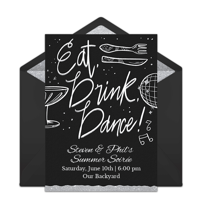 Browse free online invitations and find black and white invitations for any occasion! Be sure to let your guests know the theme of the party and specify what you'd like guests to wear (ie all white, all black, a combination, etc.). On your invitation, you can also let guests know if you'd like them to bring an appetizer, dessert, or drink. Punchbowl's Potluck Sign Up tool is ideal if you want to ask guests to contribute to the menu. Once your invite is ready, deliver it instantly by email or text and easily track RSVPs online.