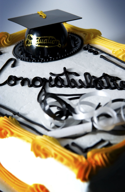 This white, black, and gold color palette lends an air of sophistication to an important celebration. Never underestimate the impact of a simple cake topper like this graduation cap!
