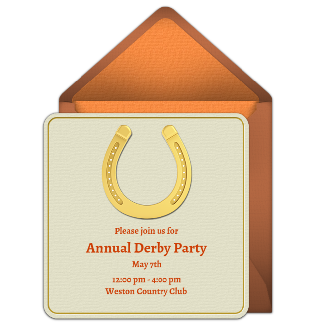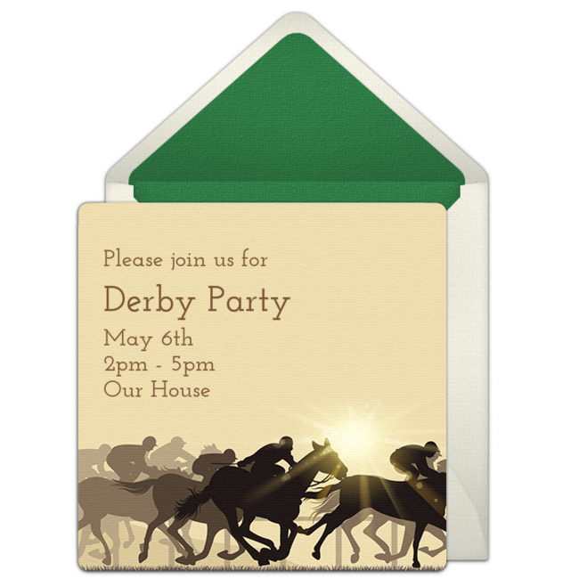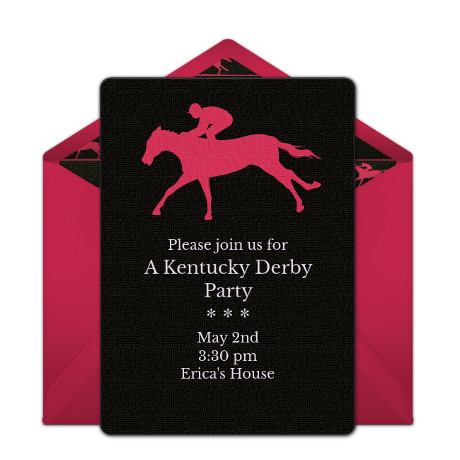 Design: Punchbowl offers some wonderful options for Kentucky Derby party invitations that include horses, roses, horseshoes, jockeys, fancy hats, and more.