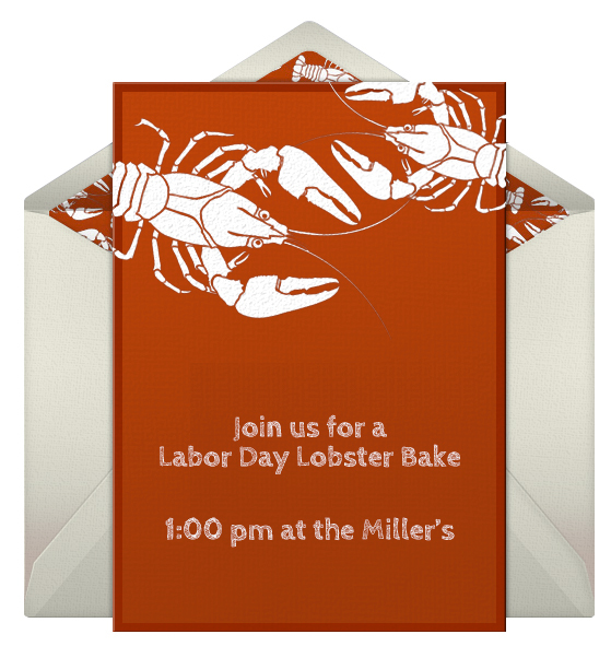 - Invitations: Begin your party on the right foot with spirited Labor Day invitations. Punchbowl offers a wide selection of online Labor Day invitations that you can customize however you please. This way, you can add photos of cute cartoon lobsters, use red font, etc. These are elegant invitations that will give you beautiful results and only take a few minutes to create!