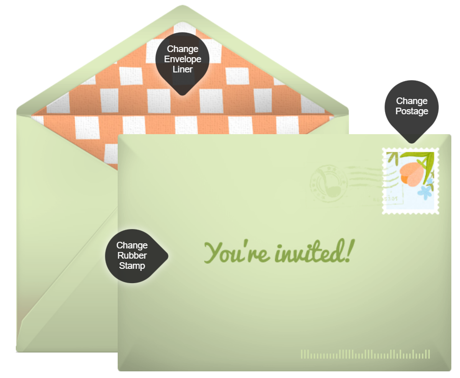 Note that you can customize the text on the invitation, the envelope liners, and the rubber stamps and postage on the outside of the envelope.