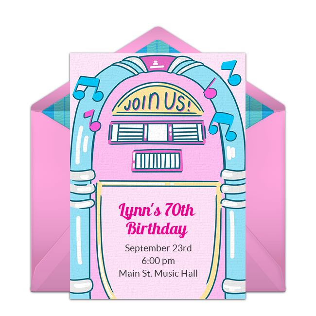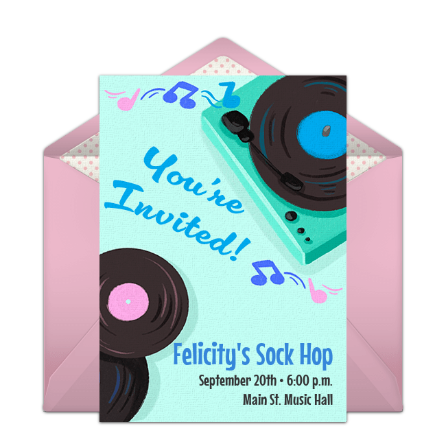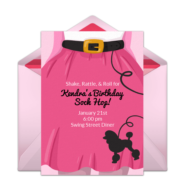 Hip or square, we all imagine the 50s in different ways: I Love Lucy springs to mind for some, while others go straight to Elvis when reflecting on America's Golden Age. Nostalgia for the 50s is party planning gold! Cocktail parties, birthdays or dinners--no matter the event, the 50s can inspire your decorations, dress, activities, and food and drink. Set the stage for your party with this Poodle Skirt invitation, Sock Hop invitation, or Jukebox invitation.