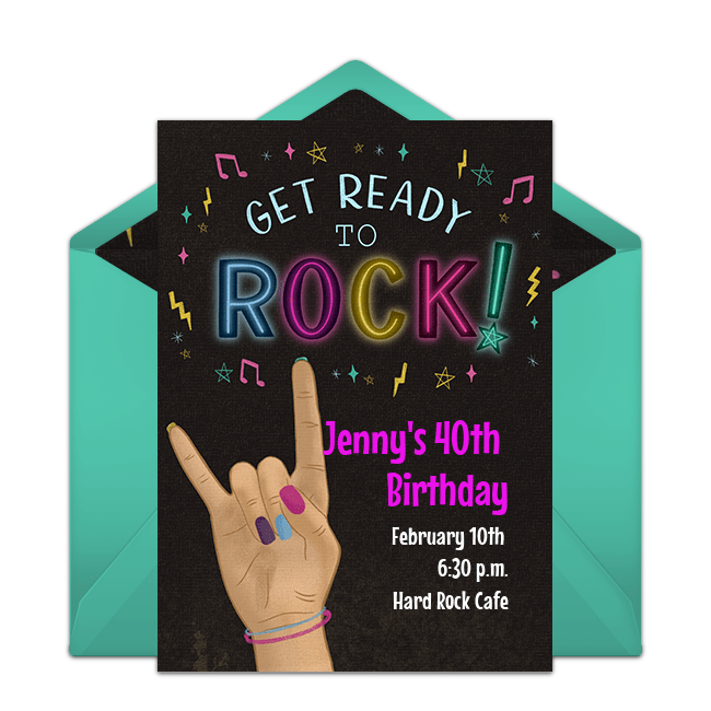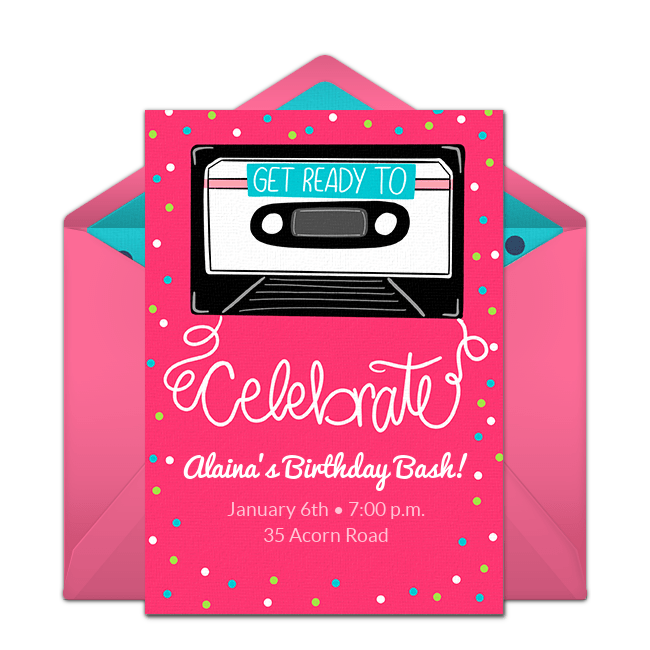 The 80s were all about big hair, bright neon colors, and the rise of the music video. The decade that brought such iconic movies as Beetlejuice, The Breakfast Club, Ghostbusters, Top Gun, ET, and Back to the Future was also responsible for advances like The Walkman, Chicken McNuggets, The Space Shuttle, and cell phones. When you’re planning a 1980s Theme Party, there is so much inspiration to work with! Start with some 80s themed party invitations like the Retro Sneakers, Ready to Rock, or Cassette Tape designs below!