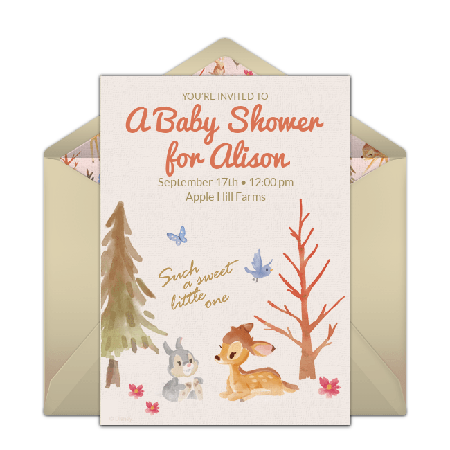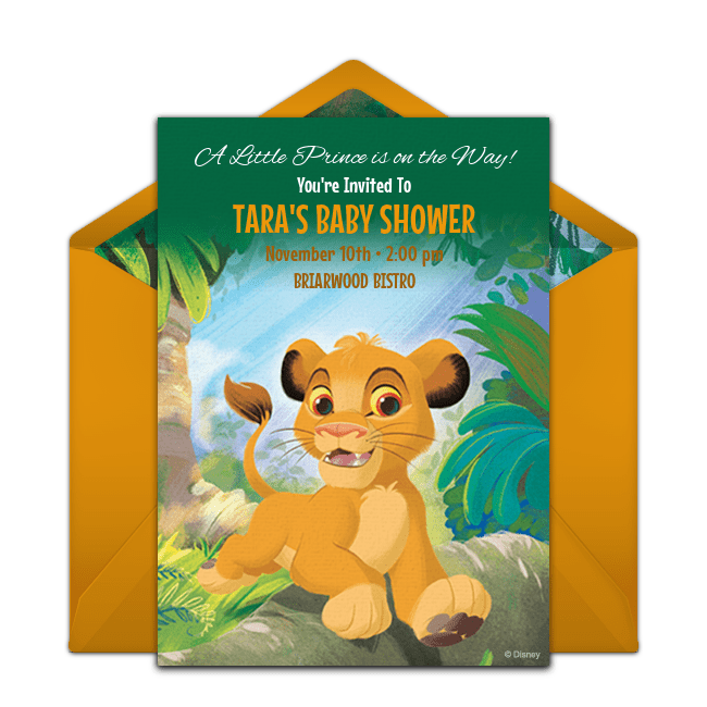Finally, let's not forget other favorite Disney characters like Dumbo, Lion King, Toy Story, and Disney Friends. Need more inspiration? Check out this Winnie the Pooh invitation and Winnie the Pooh baby shower ideas or this Bambi invitation and Bambi baby shower ideas.