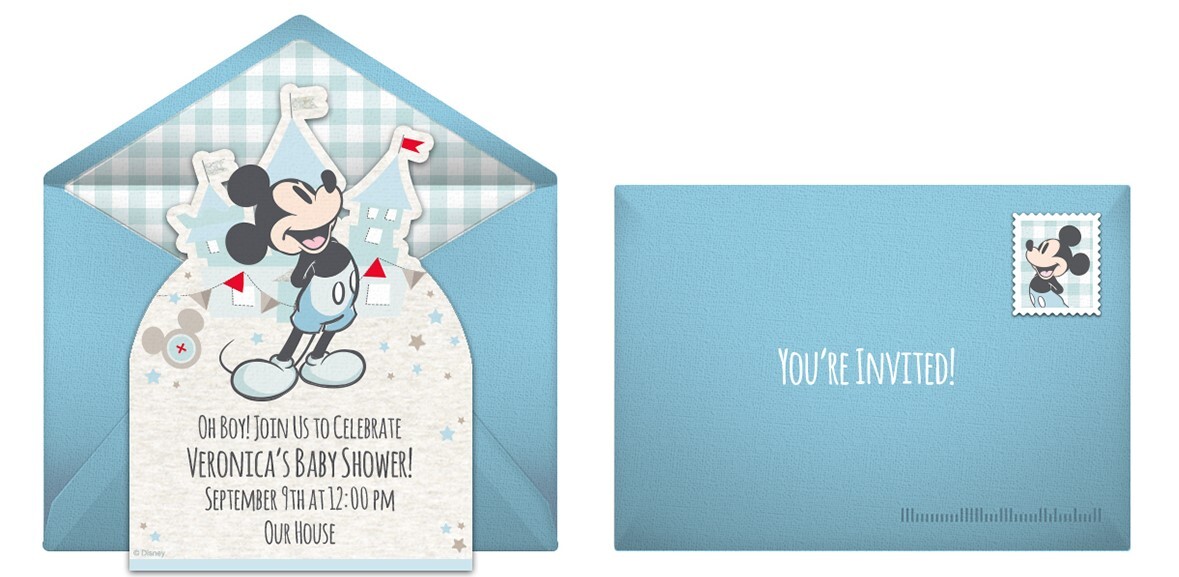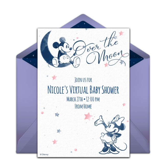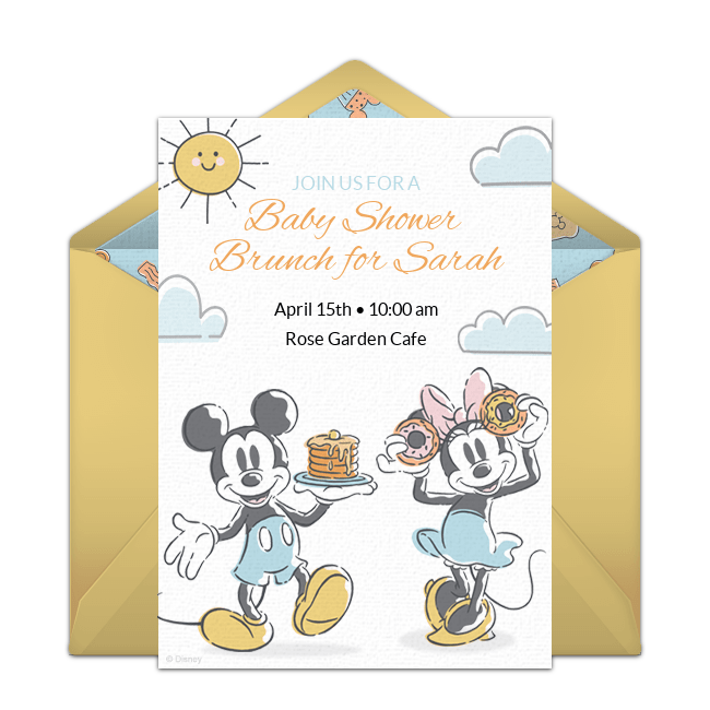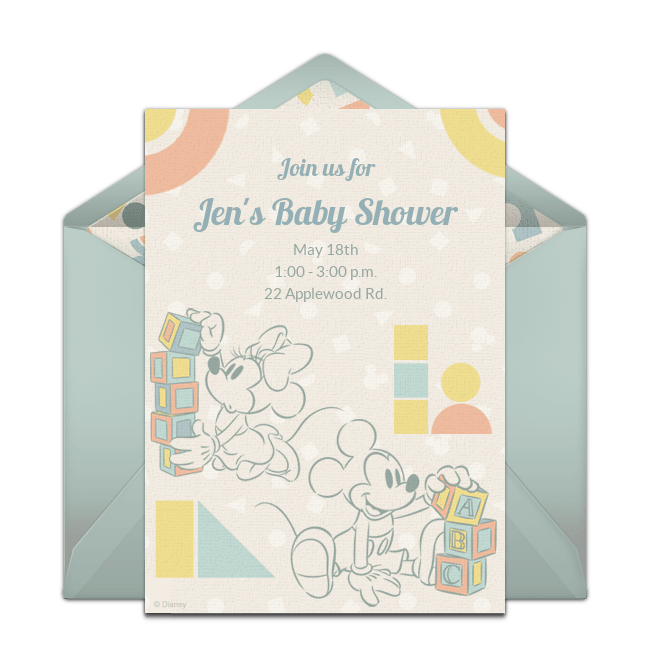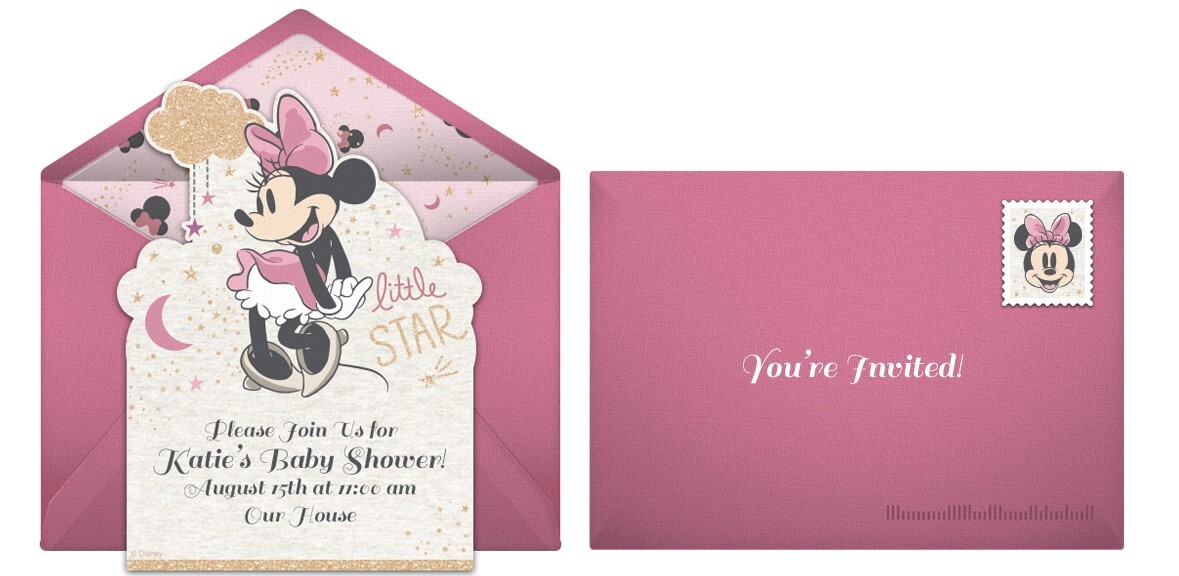 To start, find your favorite Disney invitation. You can customize this Mickey Mouse Baby Shower online invitation or this Minnie Mouse Baby Shower online invitation with the guest of honor’s name, party date, time, location, and any other details your guests should know. Once it’s just right, you can quickly and easily share your invitations via email or text.