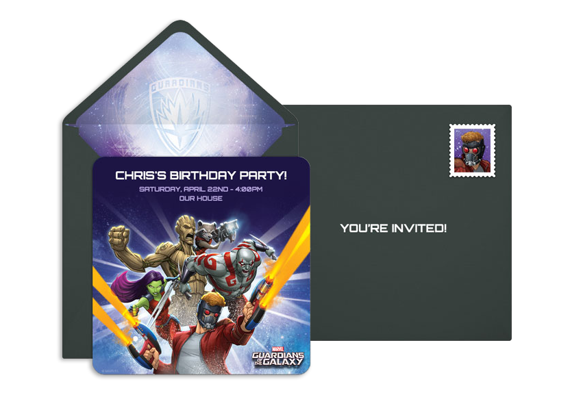 Punchbowl offers exclusive online invitations for Marvel-themed parties. Start planning an action-packed birthday party with this collection of free Guardians of the Galaxy online invitations featuring Star-Lord, Groot, Gamora, Rocket, and Drax. Choose your favorite online invitation and customize it with all the important party details that your guests will want to know — party date, time, location, and more. Once the design is ready, you can quickly and conveniently send your invitations via email or share them on social media!