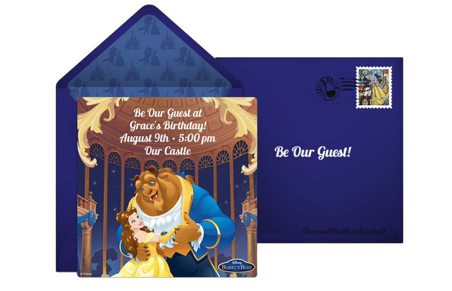 Punchbowl offers exclusive Disney Beauty and the Beast online invitations, featuring the characters you know and love – Belle and Beast. Choose a free invitation design to get started, with a gorgeous matching envelope liner and stamp. Your free Beauty and the Beast invite will provide your guests with all of the information they need for your party, and allows you to track who will be joining the celebration.