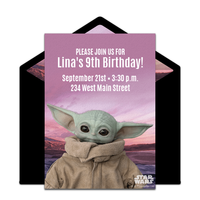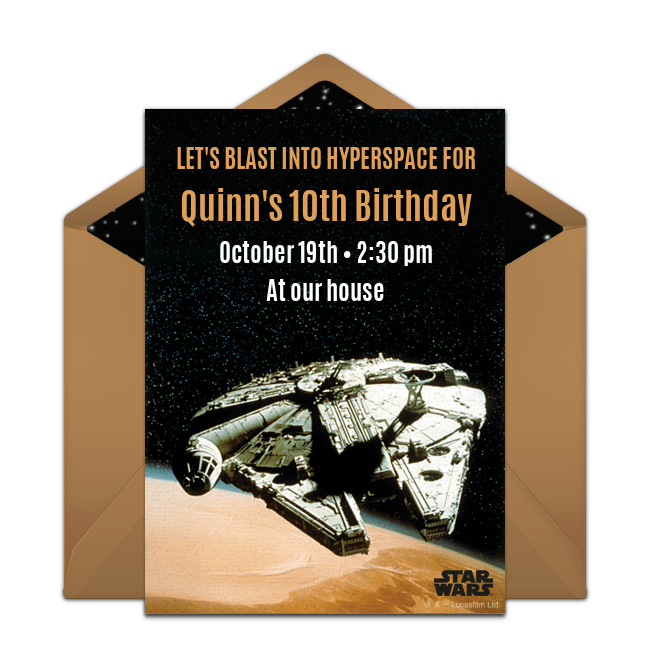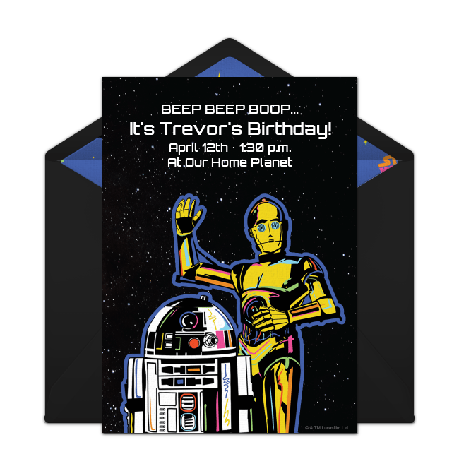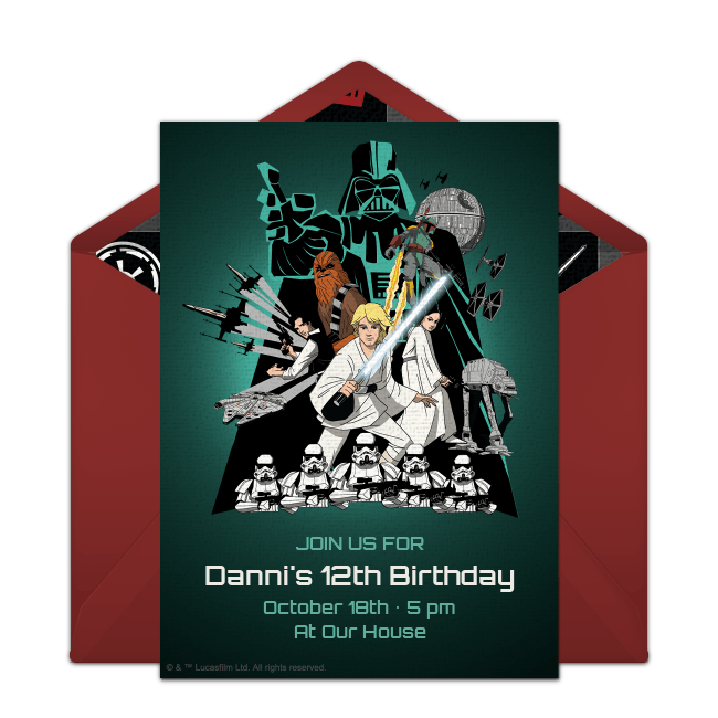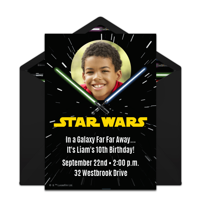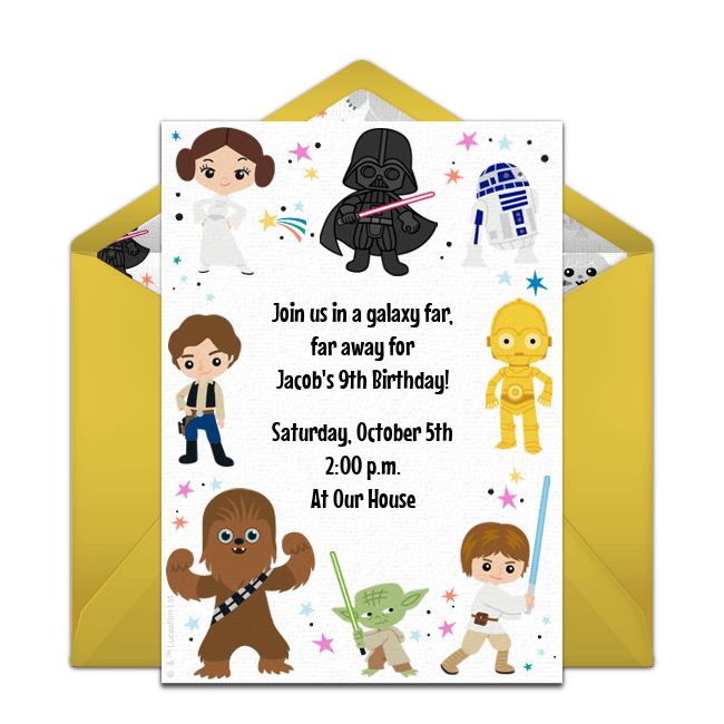 To start, browse a wide range of free Star Wars birthday invitations so you can begin to set the stage for your party. Choose from many designs featuring all of your favorite Star Wars characters and include important information like the party time, date, location and more – all online. You can even upload a photo of the birthday honoree to select invitations. Once your invitation is ready, email or text it to guests instantly then track RSVPs online.