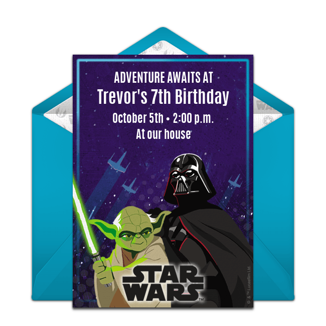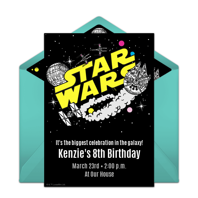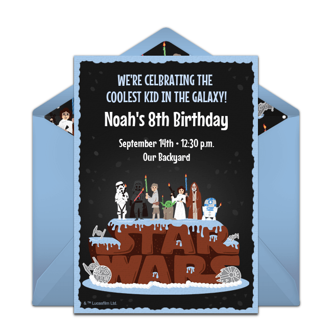 Tying in the Star Wars theme into every aspect of your Star Wars party will ensure that your child’s birthday is out of this galaxy. Get started by customizing dynamic, free Star Wars invitations.