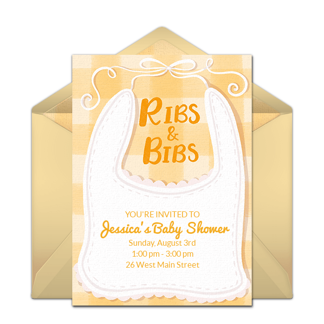 Summertime is the perfect time for BBQs! Send this cute Baby-Q baby shower invitation or this Ribs & Bibs baby shower invitation, available in yellow, pink, or blue to set the scene for your grilling celebration. Place traditional red and white checkered table cloths throughout yoru party space and place mason jars filled with wildflowers on each table. Decorate with red and white bunting, balloons, and streamers.Serve mini sliders, ribs, and barbeque chicken with plenty of BBQ side dishes and ice cream for dessert. For party favors, give guests mini bottles of barbeque sauce to take home.