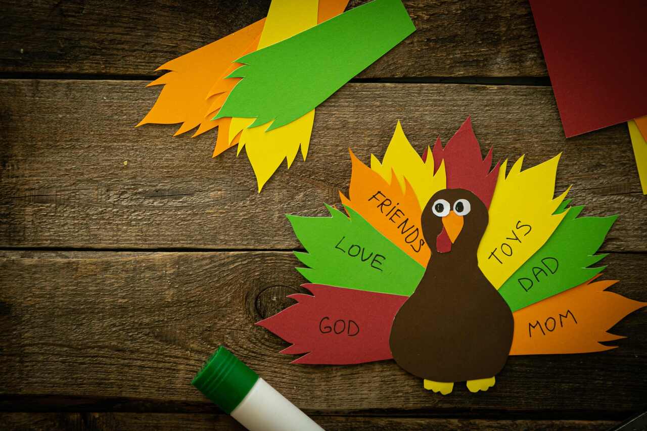 Gather some colorful construction paper or card stock, glue, and scissors for this project. Help little ones cut out turkey feathers and the turkey's body. Have them write one thing they're grateful for on each feather. Paste the feathers, feet, eyes, beak, and wattle onto the turkey body for a very festive and fun Thanksgiving craft.
