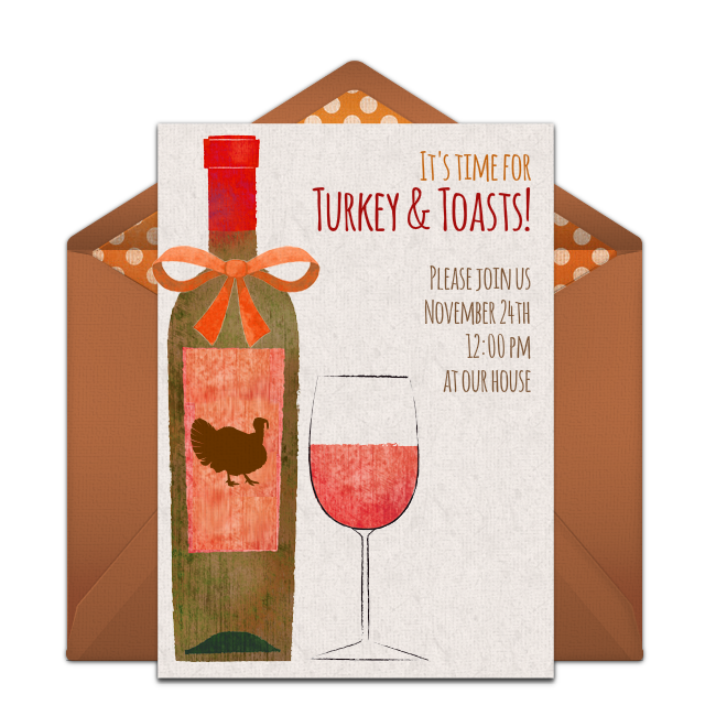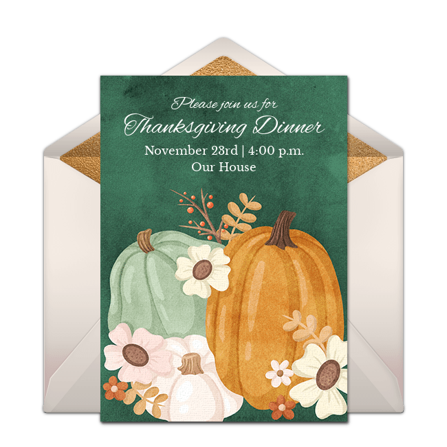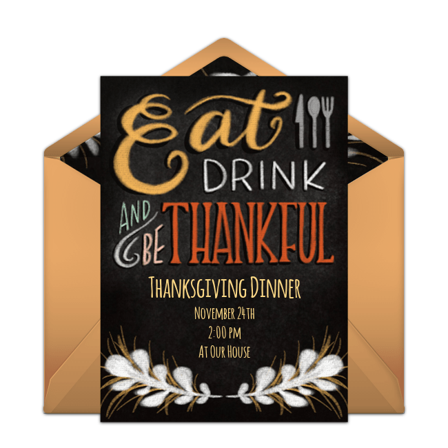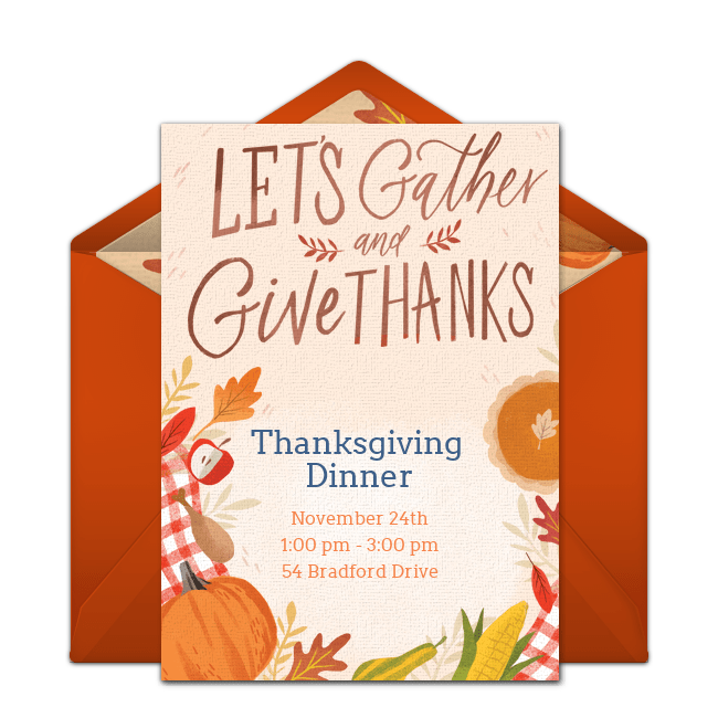 Be creative with your Thanksgiving wording ideas. Take advantage of the options above, or add your own unique, personalized touches. Need more inspiration? Check out the free Thanksgiving invitation designs below, pick your favorite, and then add the perfect Thanksgiving party invitation wording. Send these Thanksgiving invitations by email or text and gather RSVPs in minutes.