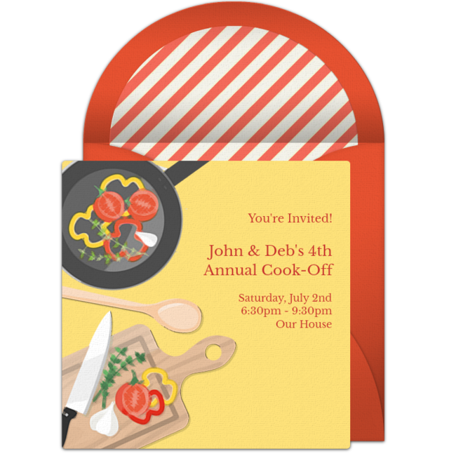 - Set the stage for your party with an online cook-off invitation to get guests excited! Customize your invitation with important event details and send it by text or email. Easily track RSVPs on the go.