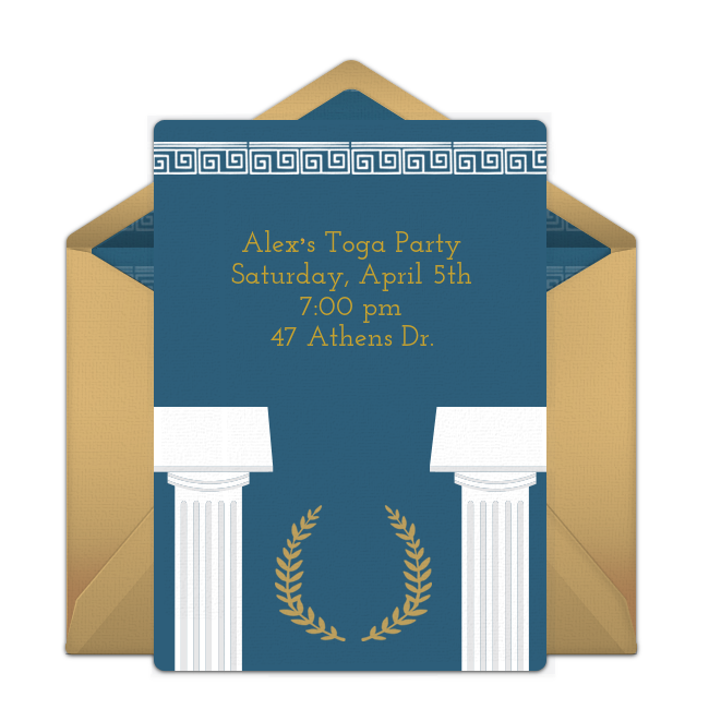 Invitation: Customize online toga party invitations to set the stage for your celebration! Add important event details to your invitation, including a note that guests should dress in togas. Once your invitation is ready, deliver it to guests instantly by text or email. toga-party-invitations.png278.37 KB
