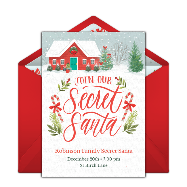 Use this gorgeous invite that features a cozy cottage to organize a Secret Santa gift exchange. Hosts can even send a private message to each participant with the name of the person for whom they are assigned.secret-santa-invitations.png266.04 KB