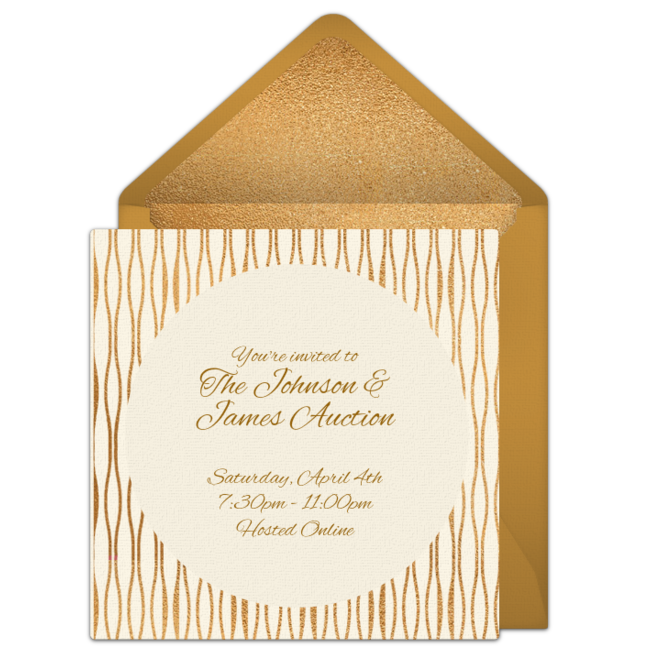 - Gold Waves Invite: This simple and elegant holiday invitation features gold lettering with a sparkly design and matching envelope liner.