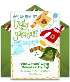 Every great party theme begins with the invitation, and we love these festive FREE Ugly Sweater party invitations you can easily personalize and send via text or email. Whether you prefer a moose pattern design that harkens back to something your grandmother once knitted for you, or an invitation starring a sweater with rather horrifying 3D appliques, there’s something for everyone. Simply add your party details, a few sweater-related puns (warmly yours, etc.) and you’re off to the races. Get started here.