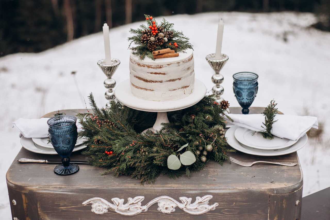 Christmas Wedding Cake. Create an elegant, multi-tiered wedding cake perfect for the holiday season with white frosting or fondant and seasonal staples like pinecones, cranberries, and mistletoe. Don’t be afraid to incorporate seasonal flavors like spiced rum, gingerbread or peppermint into your cake!