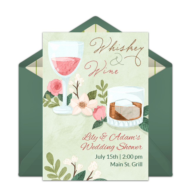 - Invitations: Incorporate your theme into gorgeous, online bridal shower invitations to give guests a taste of what to expect or customize wine-themed invitations for your event like this pink & gold wine invite or watercolor wine invite. Hosting a coed wedding shower? Incorporate liqour into your event and send this Whiskey & Wine Tasting invitation. Once you add important details to your invite, deliver it instantly by text or email. Guests can easily RSVP from their phone and you can keep track of who's attending!